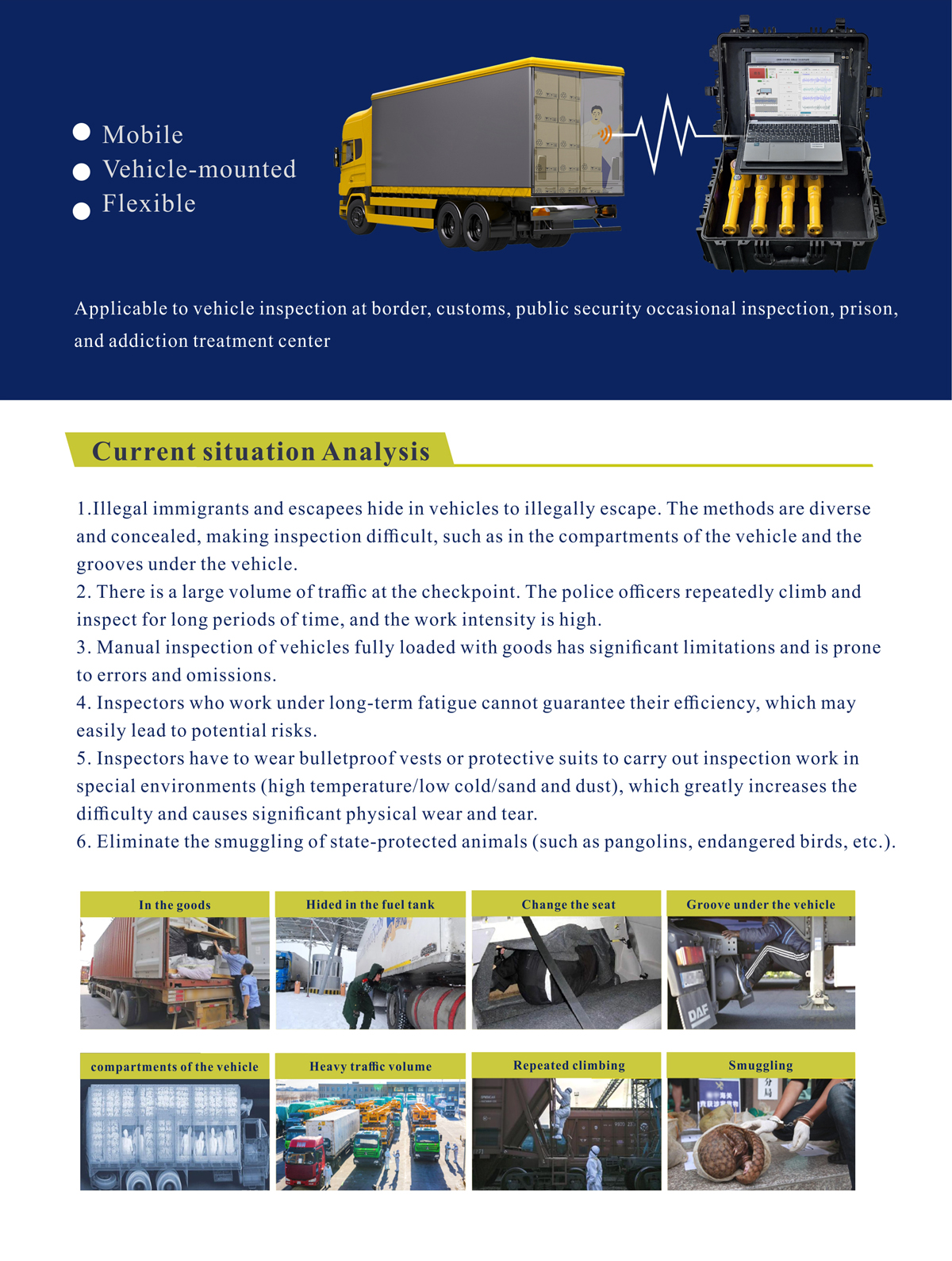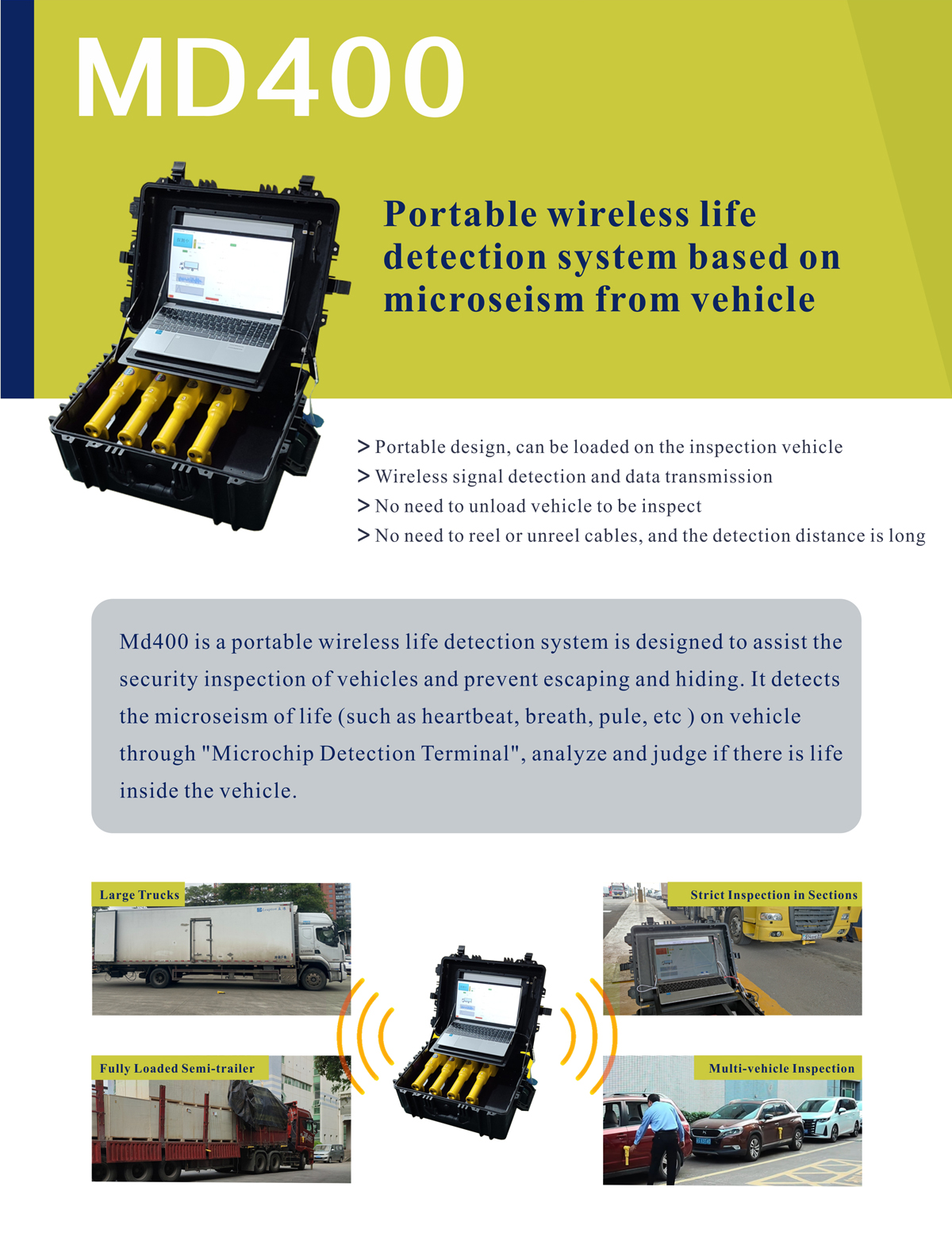 MD400 is a portable wireless life detection system is designed to assist the security inspection of vehicles and prevent escaping and hiding. It detects the microseism of life (such as heartbeat, breath, pule, etc ) on vehicle through "Microchip Detection Terminal", analyze and judge if there is life inside the vehicle.